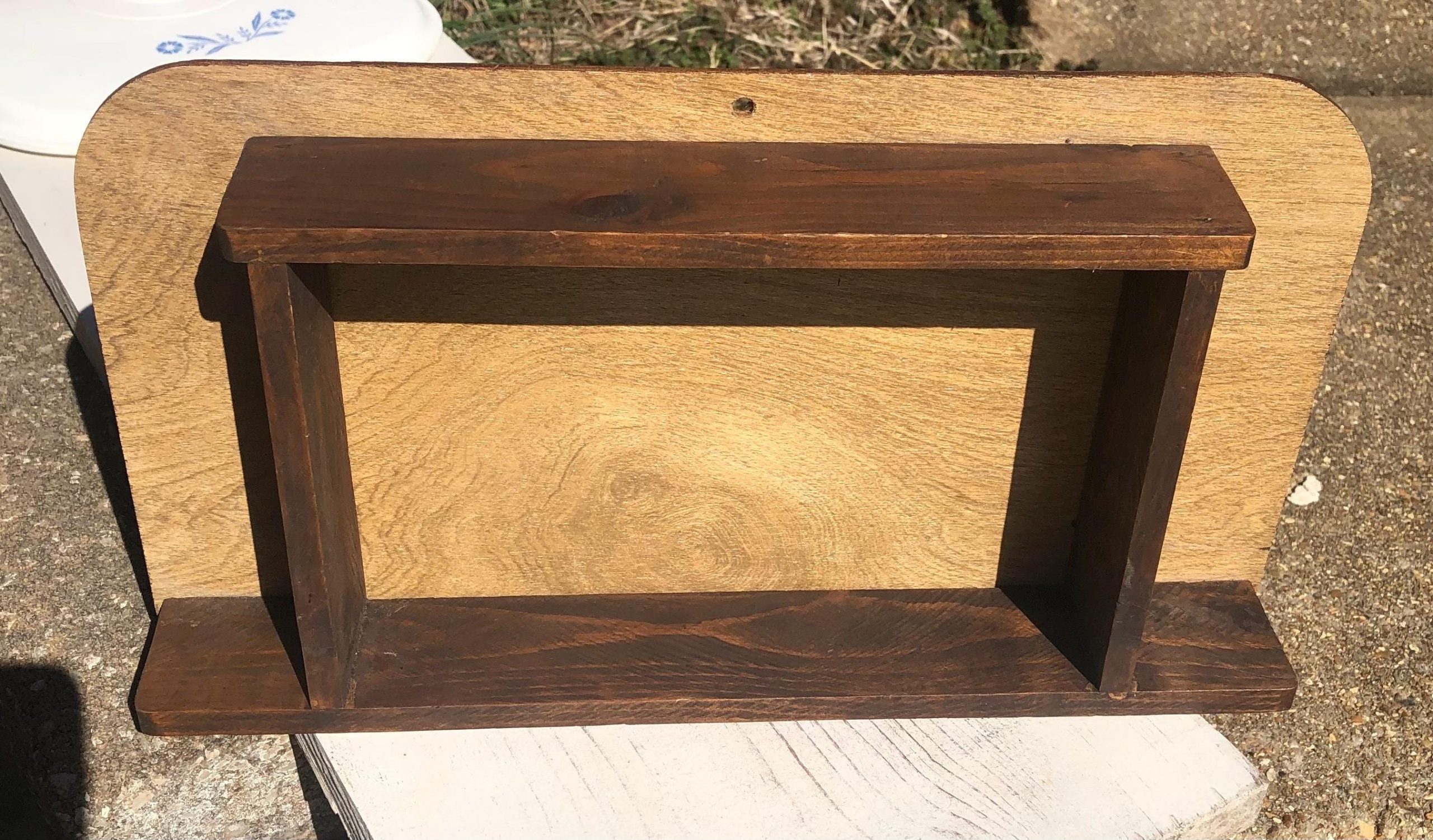 Small shelf for miniatures, it can hang on wall or stand alone on a table, it measures 13 3/4″ wide X 7 1/4″ high X 2″ deep, the back of the shelf is very thin wood, good condition with a few minor scuffs typical for age.