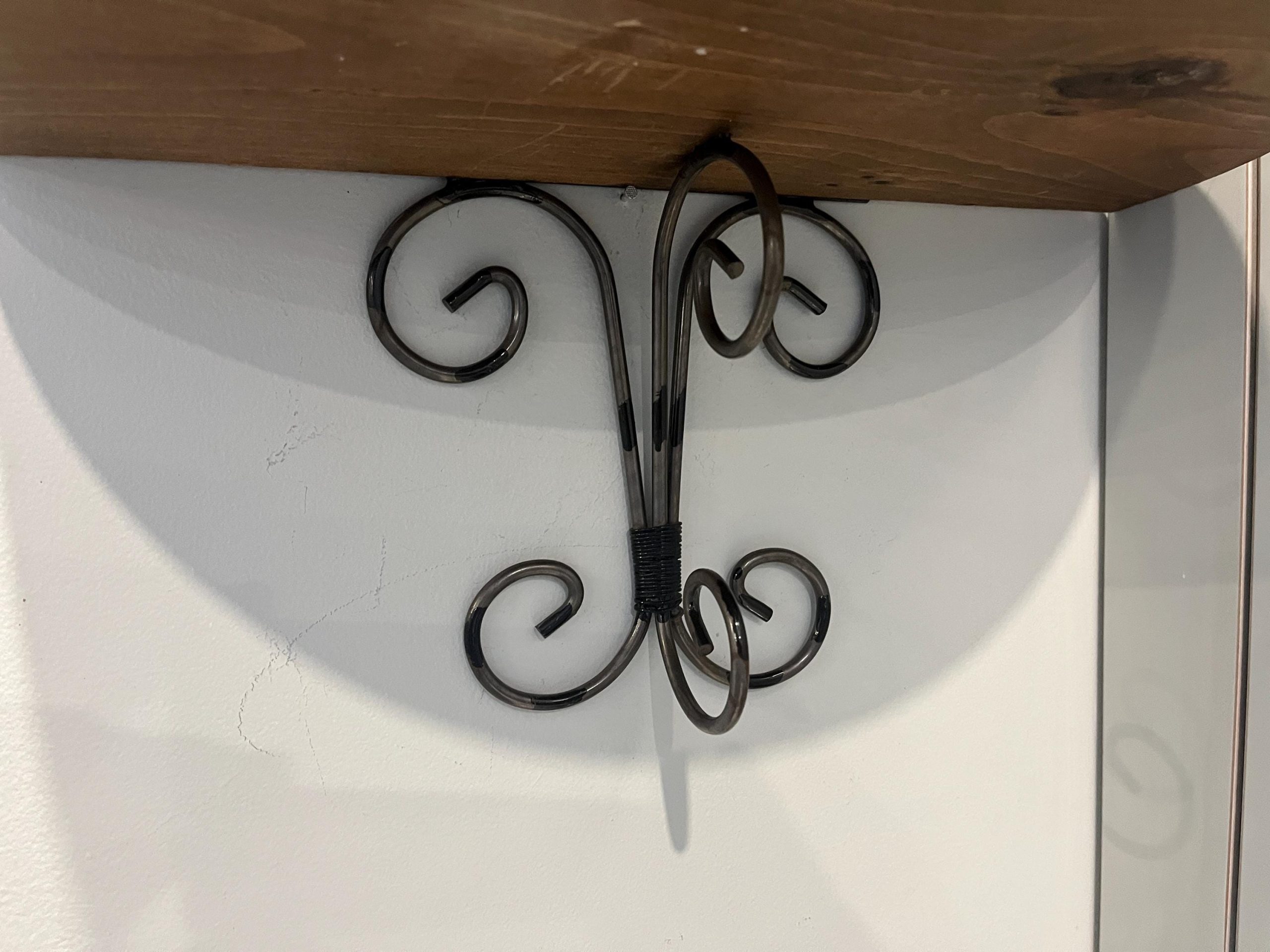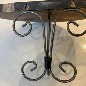 This lovely small wood and wire shelf measures 14 inches wide by 7 inches deep and 7 inches high. The perfect small shelf for a hallway or by the door. Two slots are provided on the back for easy hanging.